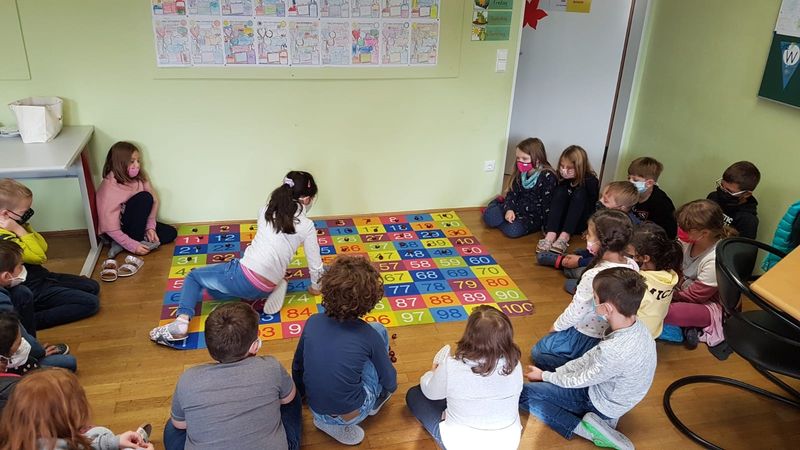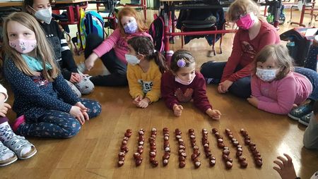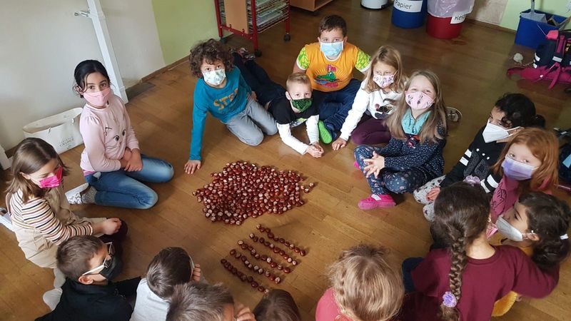 Die 2. Klassen erarbeiten gerade den Zahlenraum bis 100. Weil eine Schülerin mit ihrem Opa kistenweise Kastanien gesammelt hat, konnte das gleich im Unterricht eingebracht werden.