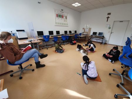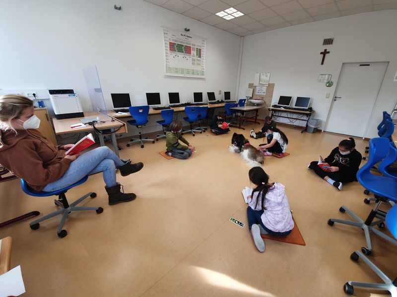 Wenn Otto, der Lesehund des Jugendtreffs K3, mit seinem Frauchen - Sozialpädagogin M. A. Stefanie Wolf - jeden Mittwoch in unsere Schule kommt, dürfen sich 8 Kinder auf zwei besonders interessante Schulstunden freuen. Gemeinsam wird Otto vorgelesen! Der Hund hört aufmerksam - ohne eine Bewertung des Lesens. Selbstverständlich kommen dabei das Streicheln und die Interaktion mit Otto nicht zu kurz und alle Kinder gehen nach den Stunden mit einem Lächeln im Gesicht zurück in ihre Klassen.