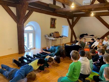 Gespannt sitzen die Kinder am Boden und lauschen der spannenden Geschichte von Krokofil und Co..