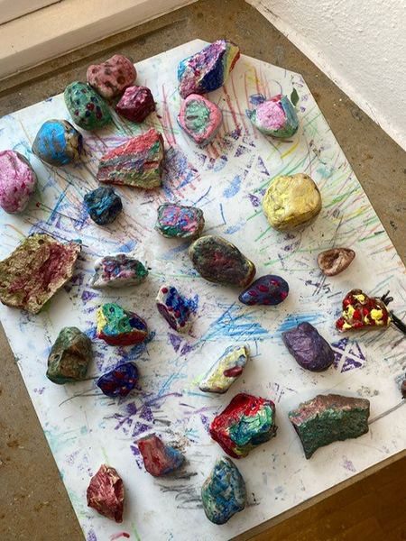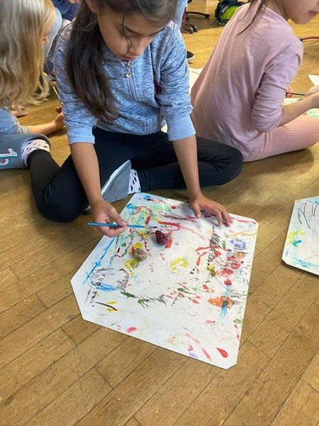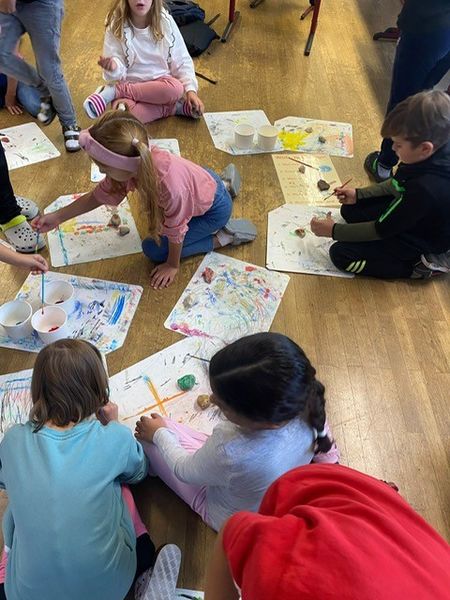 Die Ethikkinder der 2. Jahrgangsstufe bemalen Steine für den Pausenhof.