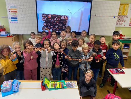 Die zweiten Klassen erkunden den Zahlenraum bis 100. Eine Schülerin hat die Klasse mit Kastanien versorgt und nun wurde daraus eine 100er-Kette gebastelt.