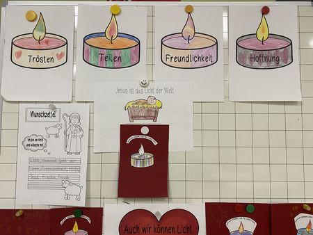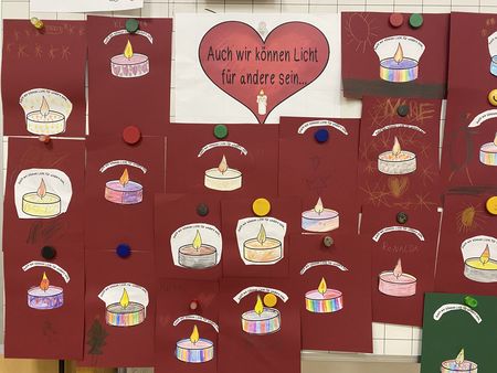 Die Klasse 1a hörte gestern die Geschichte „Die vier Lichter des Hirten Simon“. Der kleine Hirtenjunge Simon begegnet auf der Suche nach seinem verlorenen Lamm einem einsamen Menschen und schenkt ihm eines seiner 4 Lichter. Einem Wolf mit verletzter Pfote verbindet er seine Wunde und schenkt ihm ebenfalls ein Licht. Dann begegnet er einem armen Bettler. Da Simon nichts anderes hat, teilt er mit diesem ein weiteres Licht. Schließlich kommt Simon in einem kleinen Stall an und entdeckt ein neugeborenes Kind, das in einer Krippe liegt. Als er ihm sein letztes Licht schenkt - die Flamme ist inzwischen schon sehr klein geworden - erstrahlt plötzlich über dem Stall ein ganz helles Licht und erhellt die ganze Welt.