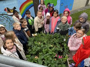 Die Kinder der 2a erkundeten den Schulgarten. Sie entdeckten noch einige Tomaten, Erdbeeren, Karotten und ganz viel Schnittlauch und ernteten es....