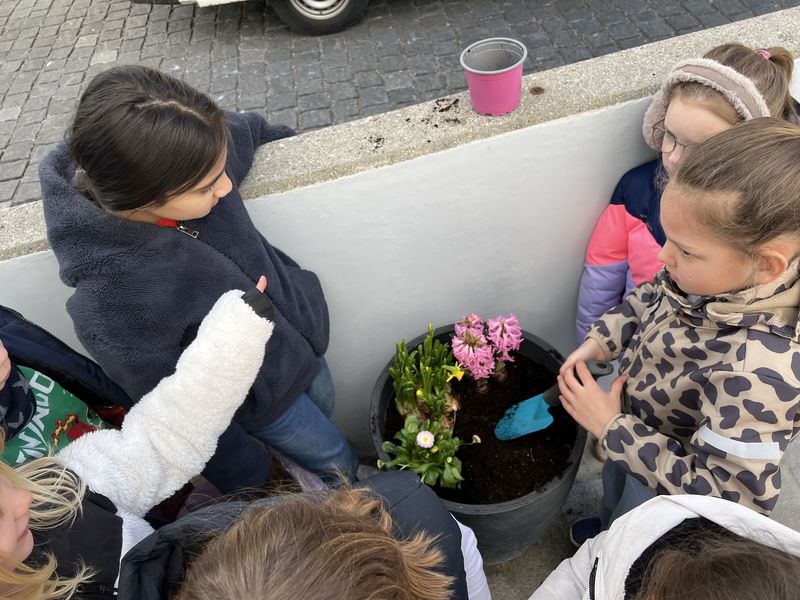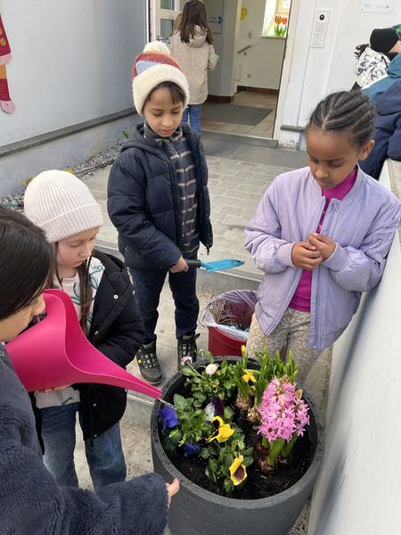 Die 2a pflanzte Frühlingsblumen in den großen Blumentopf vor der Schultüre ein! Nun ist endlich der Winter vorbei!