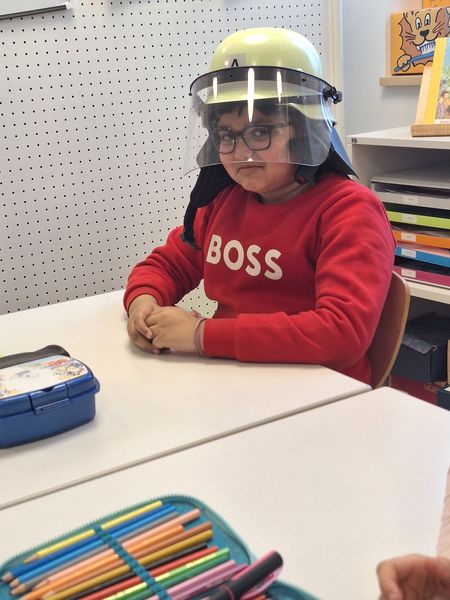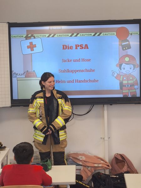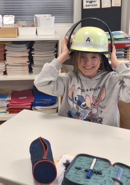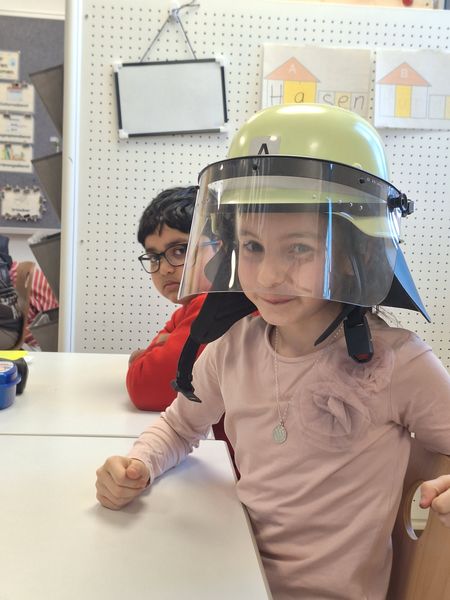 Ein besonderes Highlight war der Besuch von Julia Hess von der Freiwillige Feuerwehr Fronberg. Sie brachte echte Feuerwehrausrüstung mit, die die Kinder sogar ausprobieren durften. Erstaunt stellten sie fest, wie schwer eine Feuerwehrjacke oder eine Sauerstoffflasche ist.