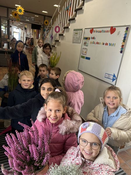 Die Sommerblumen sind verwelkt - die Klasse 2a pflanzt (bayerisch: bölzt ei) winterharte Gewächse in unseren Topf vor dem Eingang. Mit Harke, Gießkanne und guter Laune waren die Kinder eifrig bei der Sache.